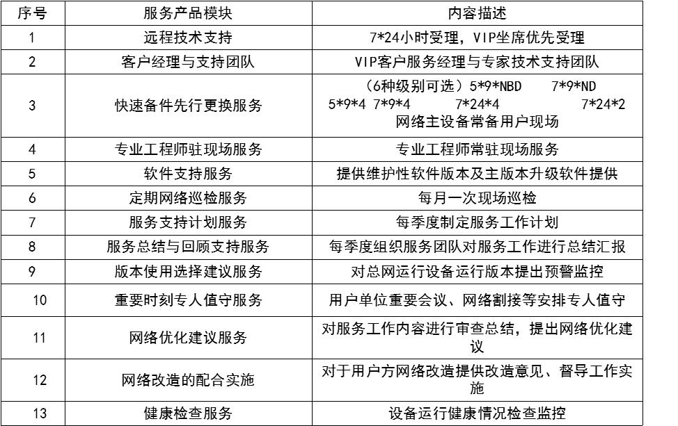 工程师重要时刻驻现场服务、现场故障诊断、现场备件更换以及现场主版本软件升级服务、定期设备除尘服务、不定期巡检服务、网络优化建议